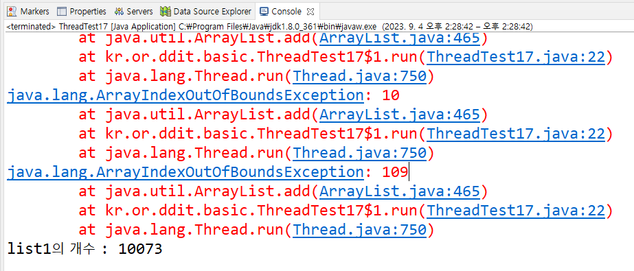 System.out.println("list1의 개수 : " + list1.size()); // 내부적으로 동기화 처리가 안되어 있어서 오류가 남.