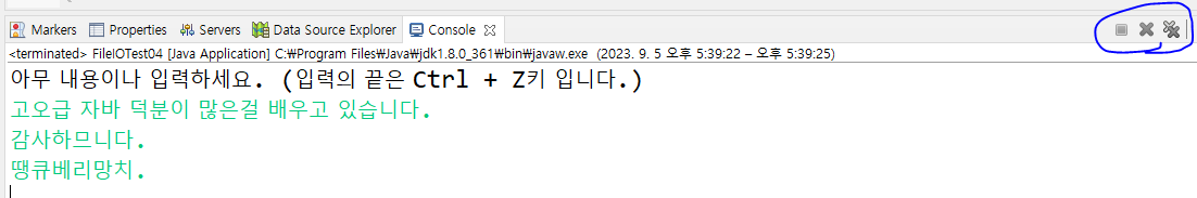 System.out.println("아무 내용이나 입력하세요. (입력의 끝은 Ctrl + Z키 입니다.)");