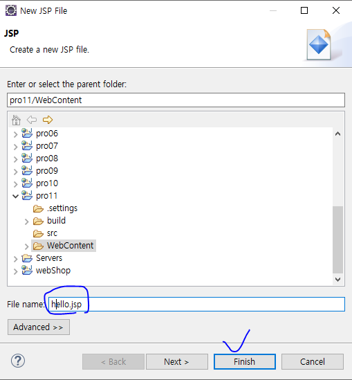 2. 파일 이름으로 hello.jsp를 입력한 후 Finish를 클릭한다.