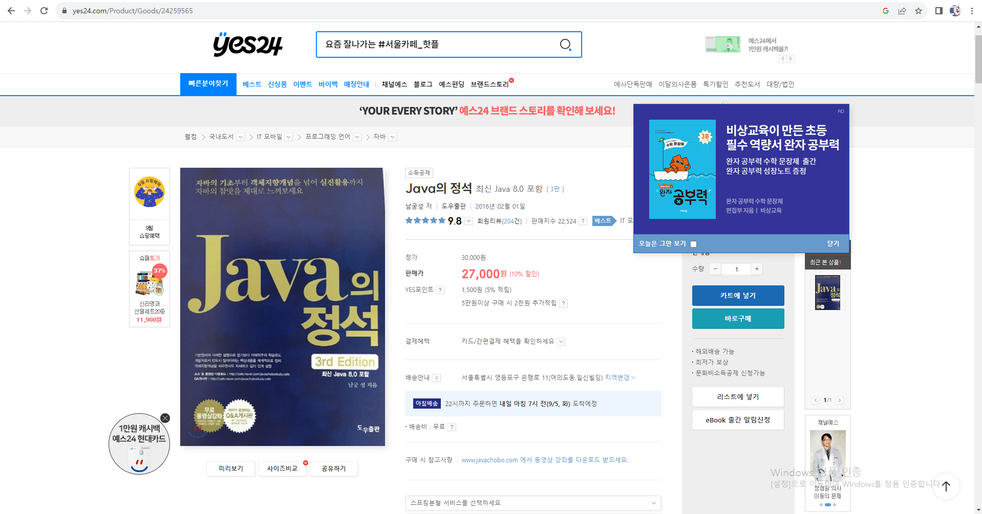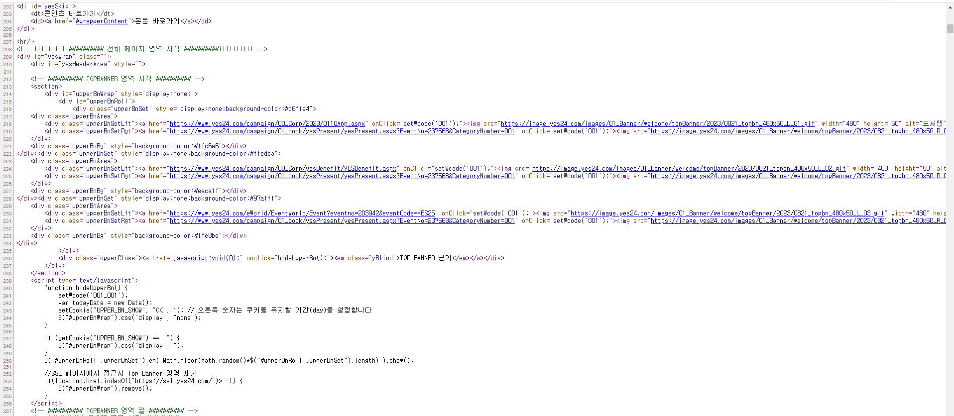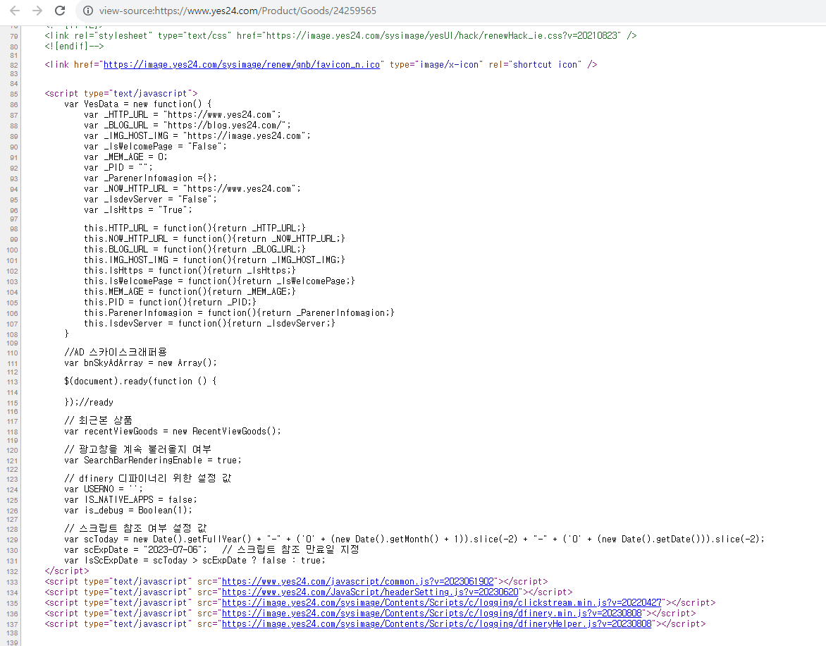 다음 그림은 실제 운영 중인 온라인 서점, 즉 도서 쇼핑몰 화면이다. 그리고 그 화면을 구성하는 자바스크립트 및 HTML 코드이다.