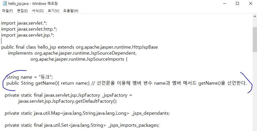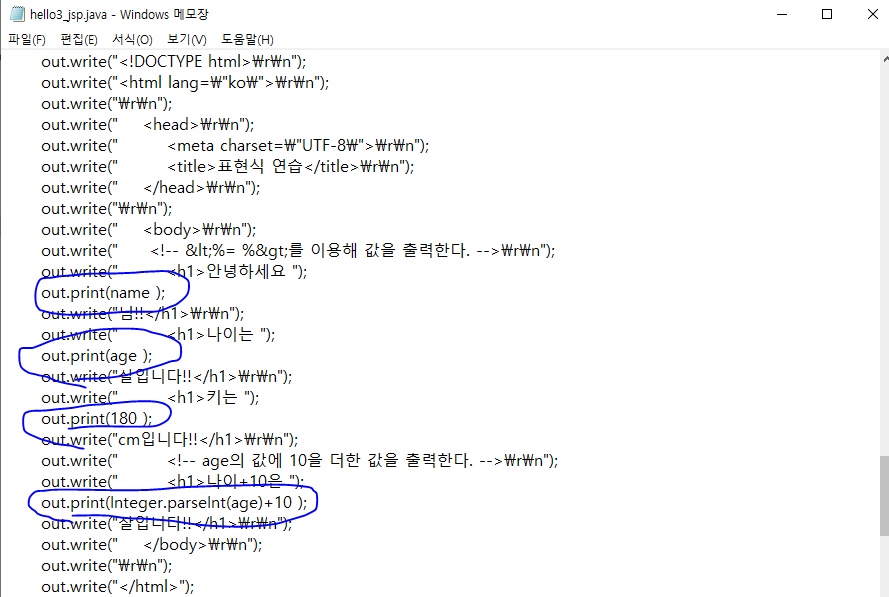 * 다음 그림은 서블릿으로 변환된 코드이다. 표현식 안의 값은 print()를 이용해 브라우저에 출력된다.