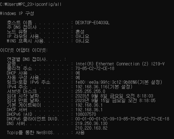 * 1) 원래의 IP주소 : 예) 192.168.36.116