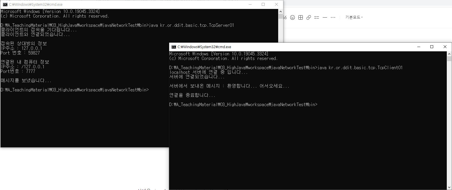 - 서버용 : java kr.or.ddit.basic.tcp.TcpServer01