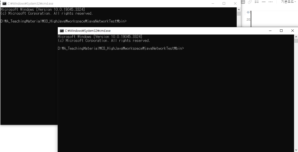 - cmd를 주소창에 쳐서 명령 프롬프트를 두 개 연다. 하나는 서버용, 하나는 클라이언트용