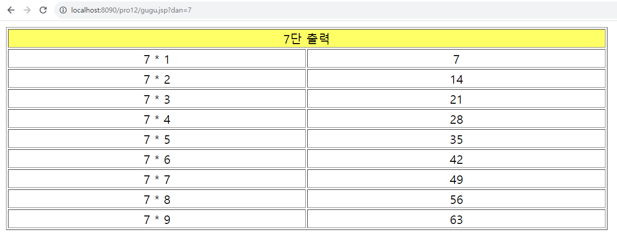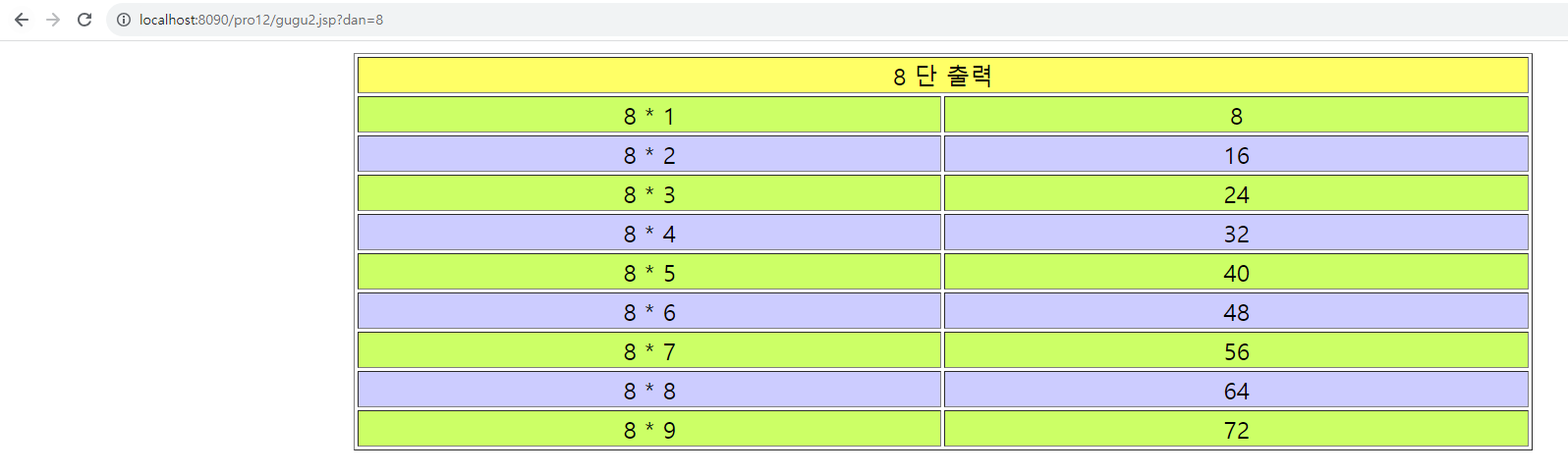 * 결과가 잘 출력된 것을 볼 수 있다. 이번에는 구구단을 리스트로 출력할 때 홀수 행과 짝수 행이 구분되도록 배경색을 지정하는 효과를 추가해 보자. 스크립트릿을 이용해 배경색을 교대로 출력하는 기능이다.