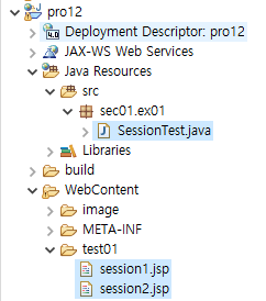 1. JSP 파일이 많아지므로 test01 폴더를 만든 후 session1.jsp, session2.jsp 등 실습 파일들을 생성한다.
