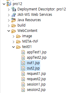 1. 다음과 같이 실습 파일 out1.jsp, out2.jsp를 준비한다.