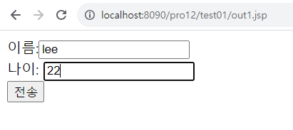 2. 첫 번째 JSP 페이지인 out1.jsp를 작성한다. 이름과 나이를 두 번째 JSP로 전송한다.