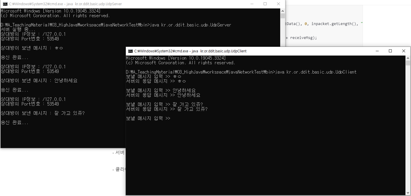 - 클라이언트 : java kr.or.ddit.basic.udp.UdpClient