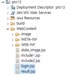 1. 새 프로젝트 pro13을 만들고 다음과 같이 실습에 필요한 이미지 파일(duke.png, duke2.png)과 duke_image.jsp, include.jsp, include2.jsp 파일을 추가한다.