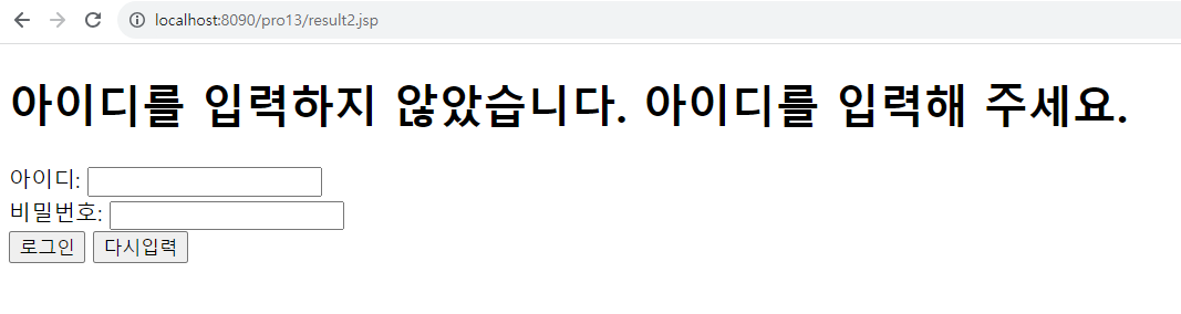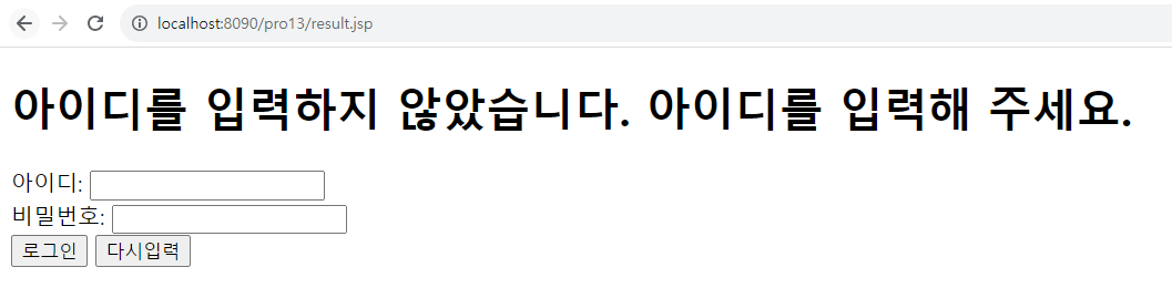 3. ID를 입력하지 않은 경우 자바의 RequestDispatcher를 사용하지 않고 포워드 액션 태그를 사용해 다시 로그인창으로 이동하도록 result.jsp를 작성한다.
