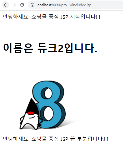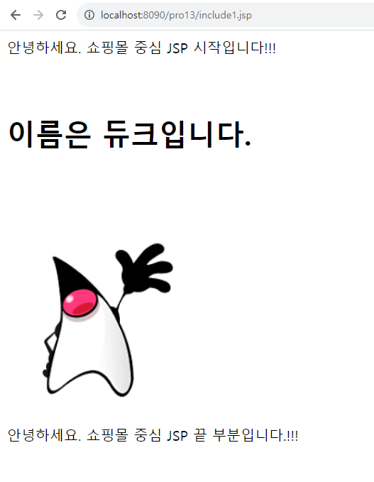 2. 자식 JSP에 해당하는 duke_image.jsp를 다음과 같이 작성한다. 부모 JSP에서 포함 요청 시 전달되는 이름과 이미지 파일을 getParameter() 메서드를 이용해 가져온 후 이름과 해당 이미지를 출력한다.