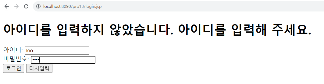 * 그런데 이 로그인 예제는 약간의 문제가 있다. 최초 login.jsp로 접속하면 로그인창에 오류 메시지("아이디를 입력하지 않았습니다. 아이디를 입력해 주세요")가 나타난다는 것이다. 페이지에 처음 접속했을 때는 ID와 비밀번호 입력창만 나타나게 하고, 오류 시에만 오류 메시지를 나타나게 하는 것이 사용자 편의성이 좋다.