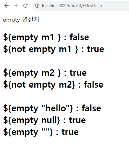 \${empty "hello"} : ${empty "hello" }<br> <!-- 문자열에 대해 false를 반환한다. -->