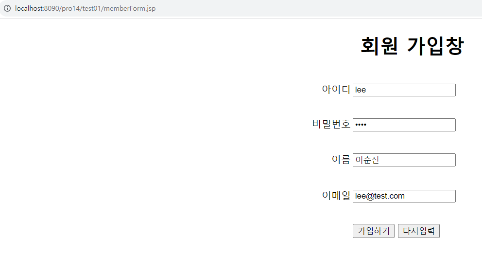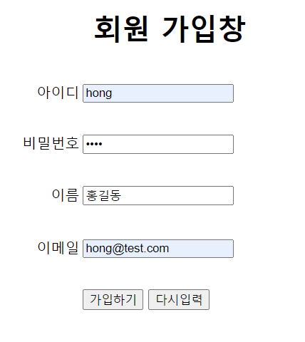 6. 브라우저에 다음 주소로 요청하여 회원 가입 창에서 회원 정보를 입력하고 가입하기를 클릭한다.