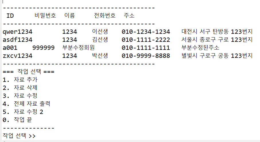 System.out.println(" ID\t 비밀번호\t 이름\t 전화번호\t 주소");
