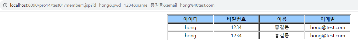 2. 다음의 주소로 요청하면 test01/member1.jsp로 리다이렉트된다. 그러면서 매개변수로 전달한 회원 정보를 출력한다.