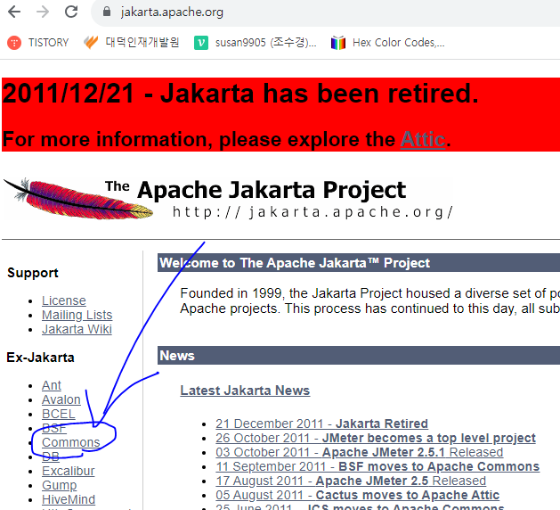 1. jakarta.apache.org 로 접속한 후 왼쪽 메뉴에서 Commons 를 클릭한다.