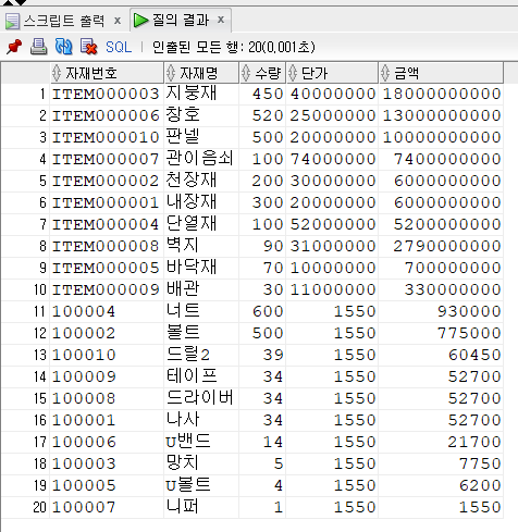 SELECT * FROM ITEM; -- 자재 테이블