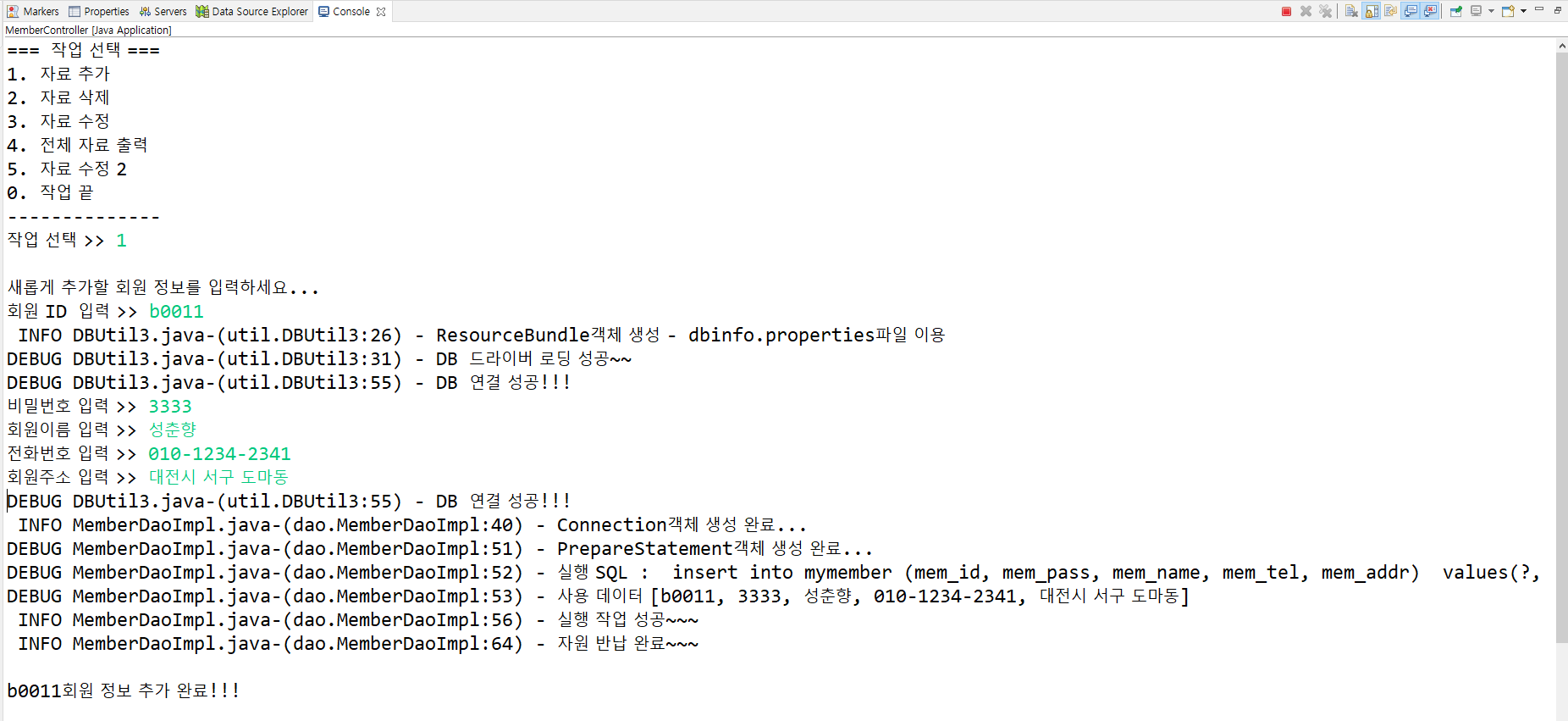 logger.debug("사용 데이터 [" + memVo.getMem_id() + ", " + memVo.getMem_pass() + ", " + memVo.getMem_name() + ", " + memVo.getMem_tel() + ", " + memVo.getMem_addr() + "]");