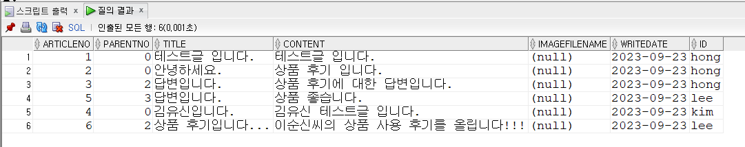 VALUES (1, 0, '테스트글 입니다.', '테스트글 입니다.', null, sysdate, 'hong');