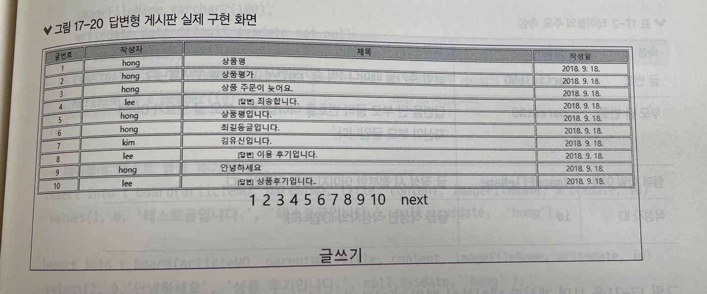 * 이번에 우리가 실습을 통해 구현할 답변형 게시판의 글 목록은 다음과 같은 형태이다.