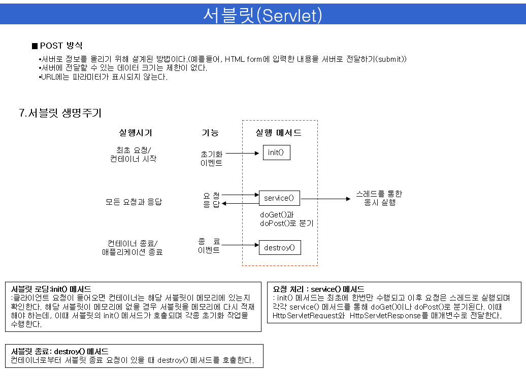 * 4. service()메서드는 전송 방식(GET, POST등의 메서드 타입)을 체크하여 적절한 메서드를 호출한다.
