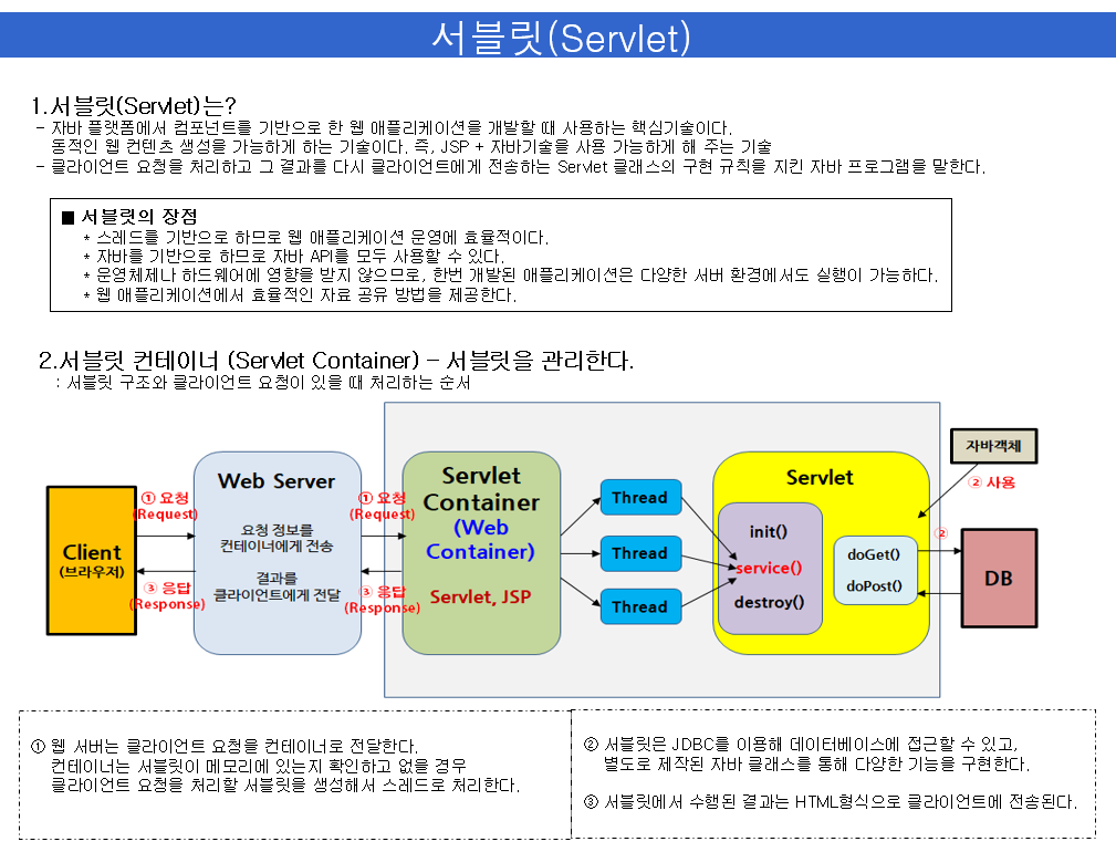 * 3. Servlet Container는 개별 요청을 처리할 쓰레드를 생성하여 해당 서블릿 객체의 service()메서드를 호출한다.