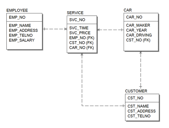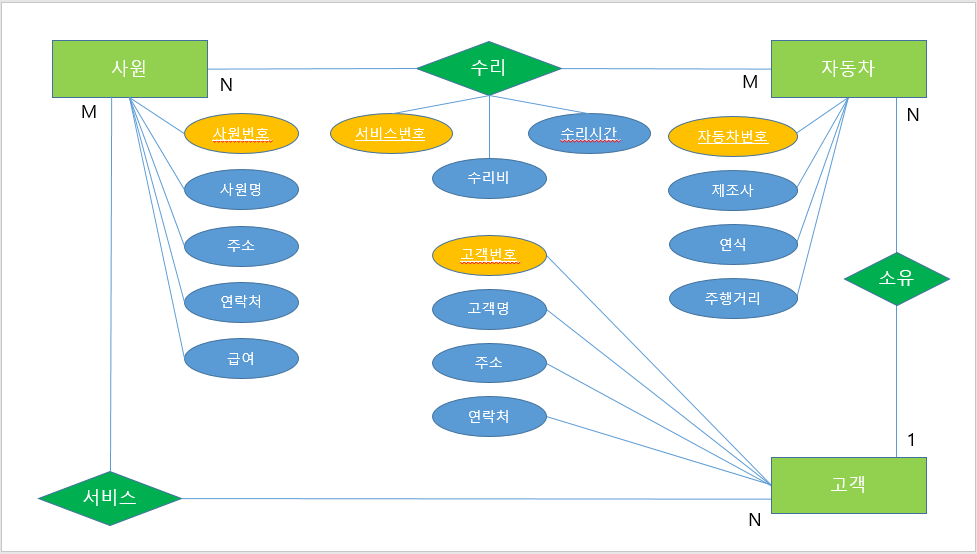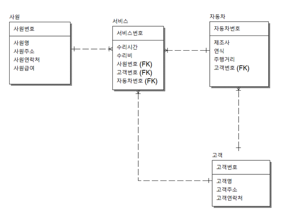 - 자동차수리 전문점 ‘다수리’는 사업확장을 위해 자동차수리 서비스와 직원을 관리할 수 있도록 데이터베이스를 구축하려고 한다.