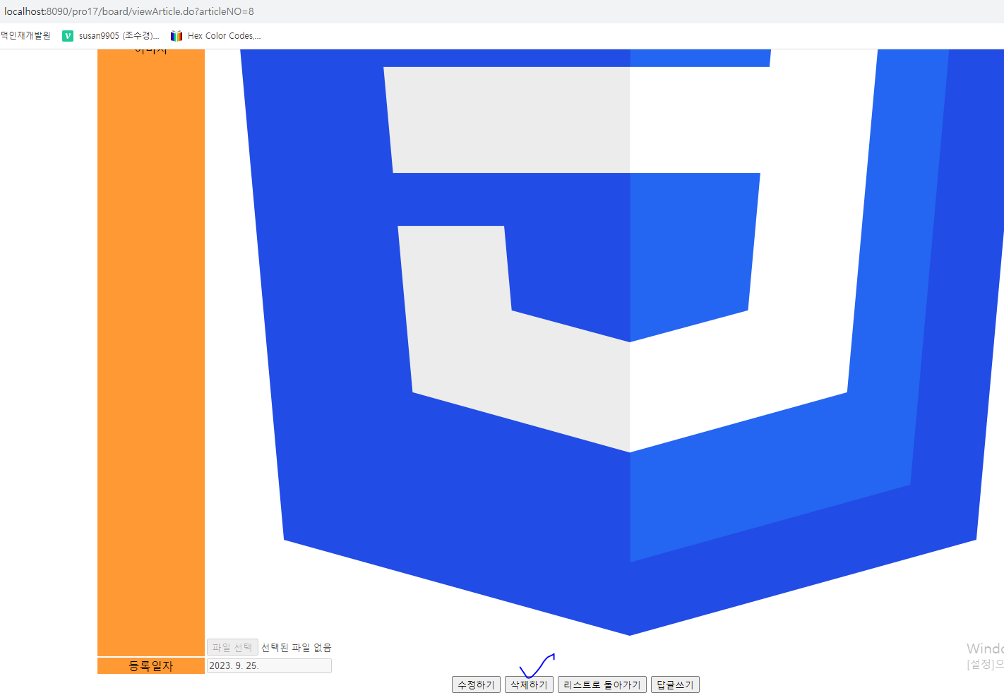 6. 글 상세창에서 삭제하기를 클릭해 /board/removeArticle.do?articleNO=8로 요청한다.