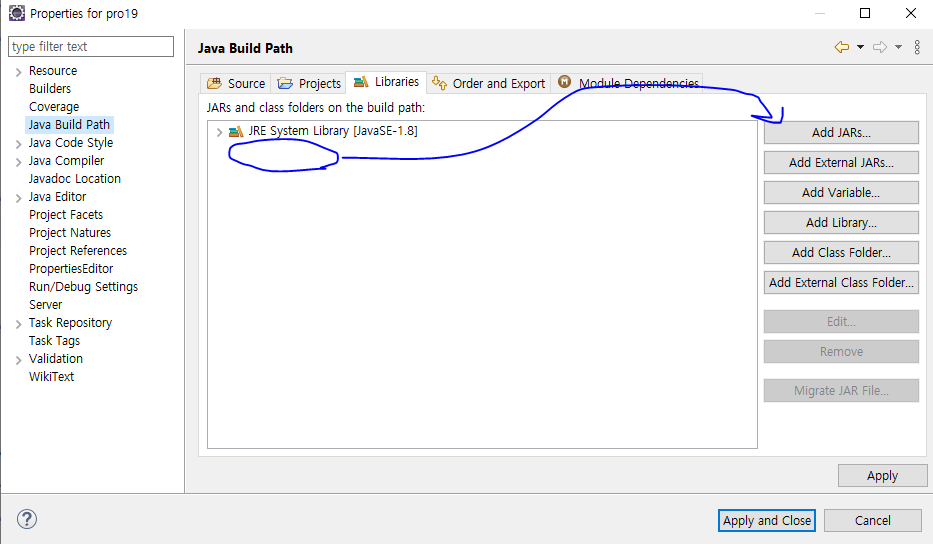 6. pro19를 선택하고 마우스 오른쪽 버튼을 클릭한 후 Build Path > Configure Build Path...를 선택한다.
