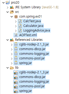 1. 새 프로젝트 pro20을 만들고 lib 폴더를 만들어 라이브러리 클래스 패스를 설정한다. 그리고 AOP 설정 파일인 AOPTest.xml을 src 패키지에 생성한다.