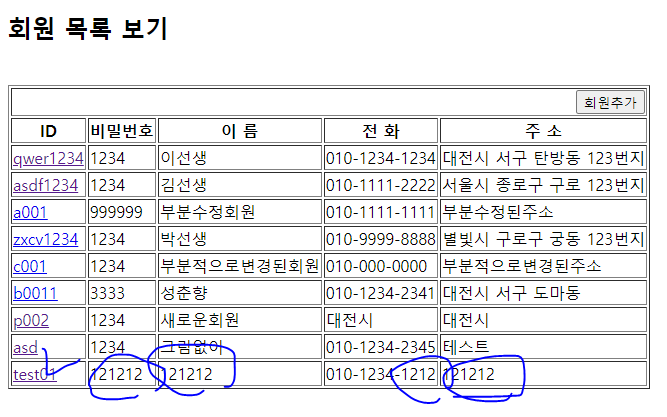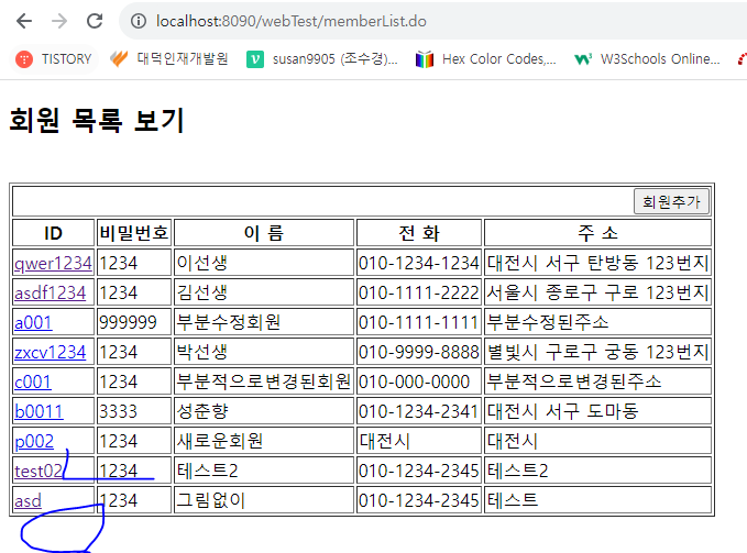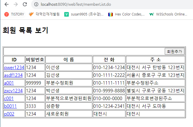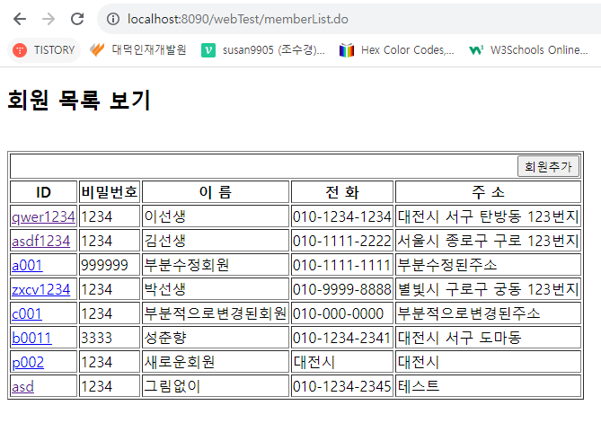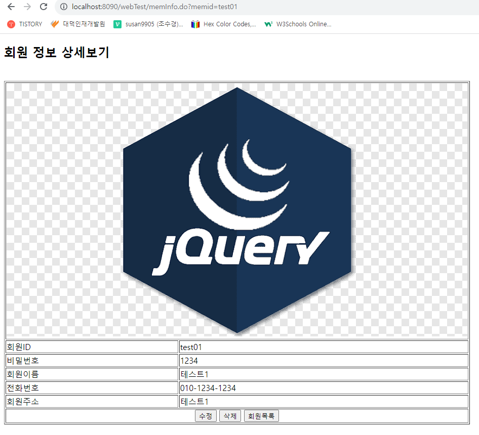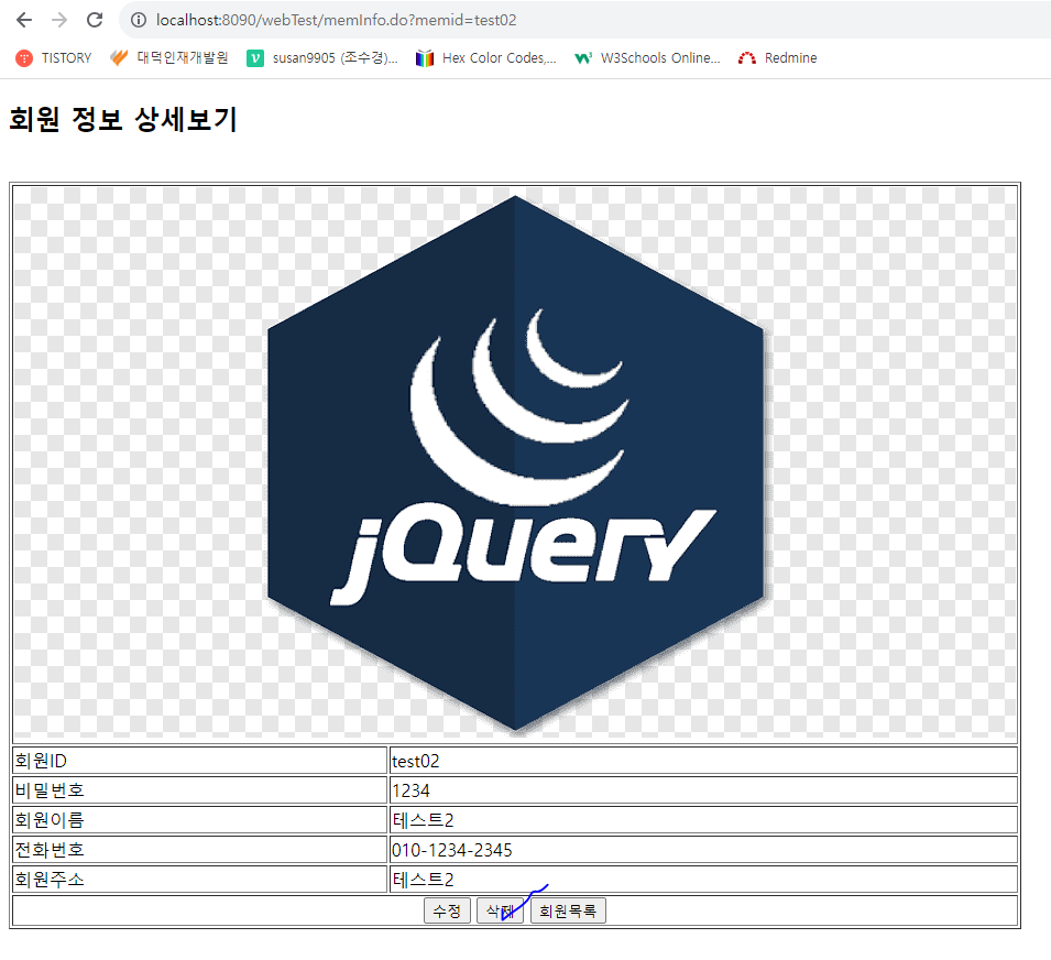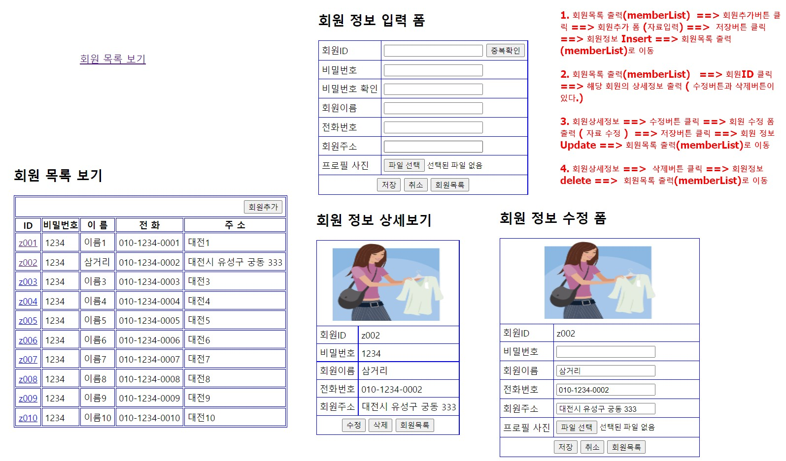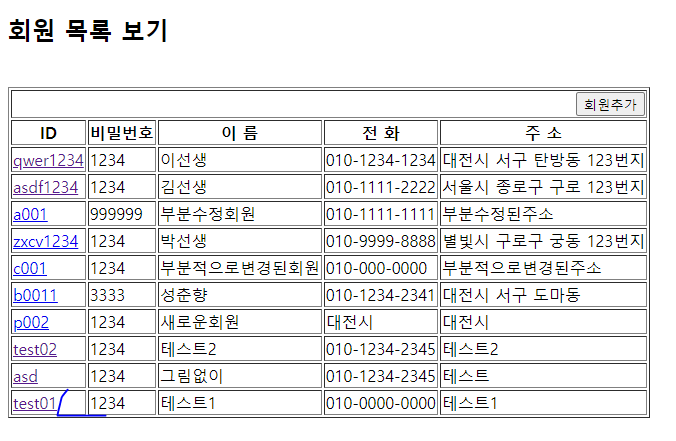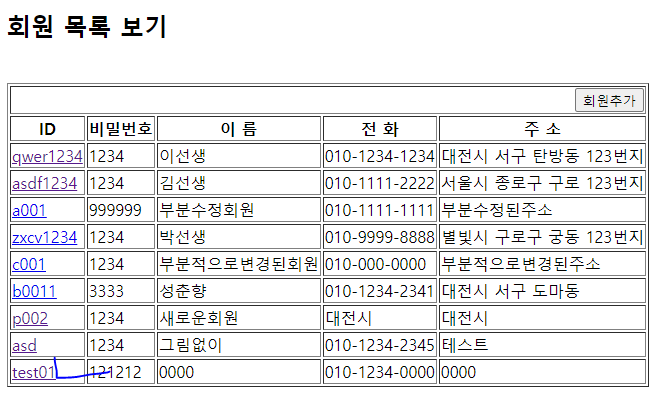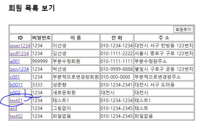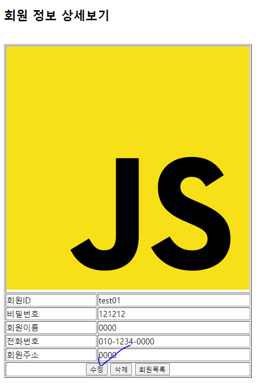 회원목록 출력(memberList) ==> 회원ID 클릭 ==> 해당 회원의 상세정보 출력 ( 수정버튼과 삭제버튼이 있다.)
