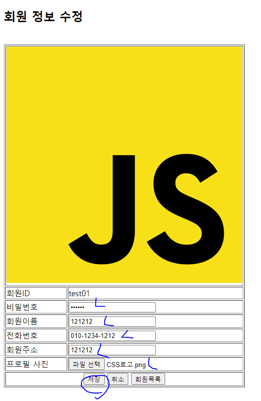 회원상세정보 ==> 수정버튼 클릭 ==> 회원 수정 폼 출력 ( 자료 수정 ) ==> 저장버튼 클릭 ==> 회원 정보 Update ==> 회원목록 출력(memberList)로 이동