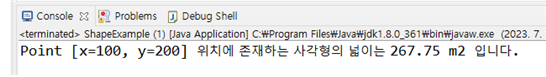 System.out.println(p1 + " 위치에 존재하는 사각형의 넓이는 " + area + " m2 입니다.");