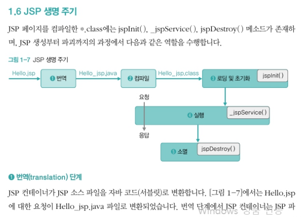 JSP는 생성부터 파괴까지 번역 -> 컴파일 -> 로딩 및 초기화 -> 실행 -> 소멸의 과정을 거친다.