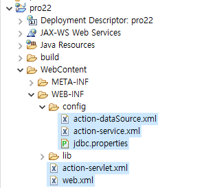 따라서 이번에는 아주 기초적인 것만 짚고 넘어갈 것이다. 마이바티스는 추후에 다룰 것이다.1. 새 프로젝트 pro22를 만들고 pro21의 lib 폴더의 라이브러리와 web.xml, action-servlet.xml을 복사한 후 동일한 위치에 붙여 넣는다.