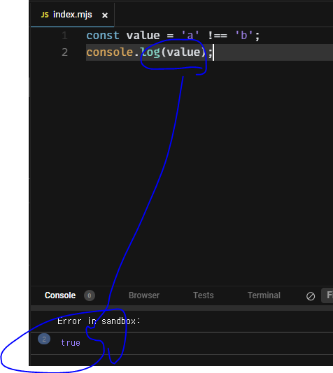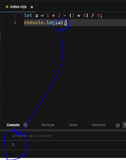 * 위 코드는 a 값을 선언할 때 1 + 2 의 결과물을 담는다. 따라서 콘솔에선 3 이라는 숫자가 나타난다.