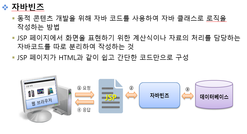 자바빈즈는 동적 콘텐츠 개발을 위해 자바 코드를 사용하여 자바 클래스로 로직을 작성하는 방법이다.