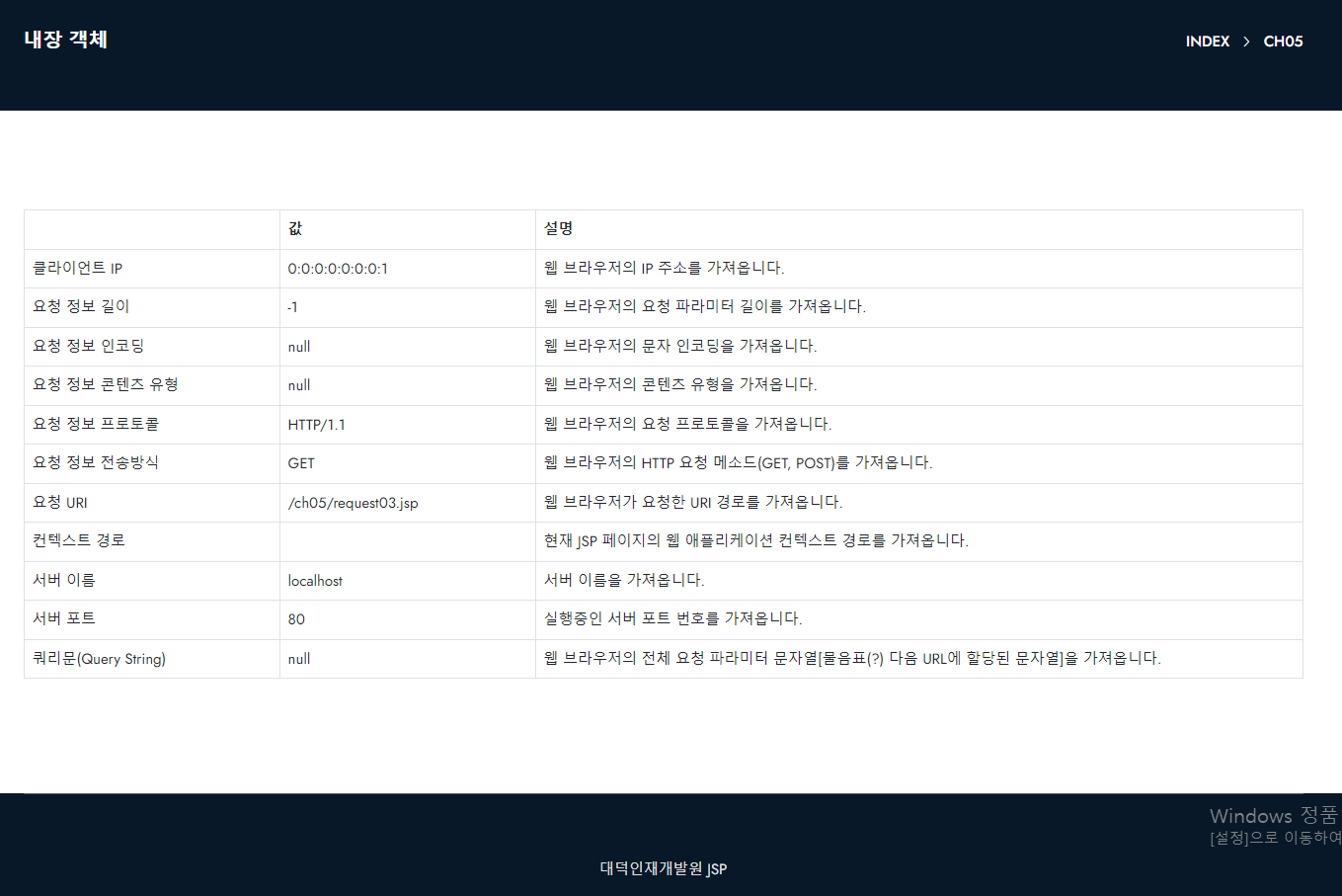 // 설정된 헤더 이름의 값을 가져오도록 request 내장 객체의 getHeader() 메소드를 작성함.