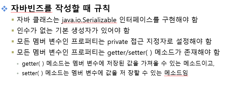 자바빈즈는 데이터 표현을 목적으로 하는 자바 클래스이므로 기존의 자바 클래스를 작성하는 방법과 동일하게 작성한다.