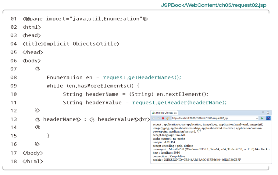 // 모든 헤더 이름을 가져오도록 request 내장 객체의 getHeaderNames() 메소드를 작성하고