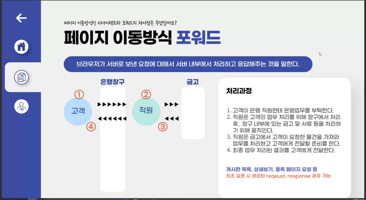 * 포워드 : 페이지만 요청할 때, 데이터를 가용하지 않는 상태. 목록 페이지, 상세 보기 페이지, 등록 페이지, 메인 페이지 등