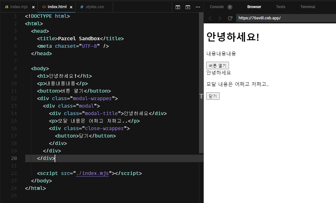 * 이제, index.js 를 열어서 버튼과 모달의 DOM 을 선택해주고, 클릭 이벤트를 설정해주자.