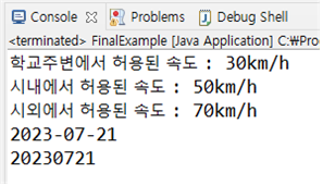 final int SCHOOL_ZONE_SPEED = 30; // 상수의 변수명은 다 대문자로 구성되므로 _ 로 단어를 구분(snake case)한다.