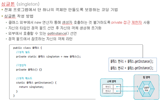 | private static 클래스명 instance = null; static 클래스 getInstance() { if(instance = null) { instance = new 클래스명(); return instance; } } |