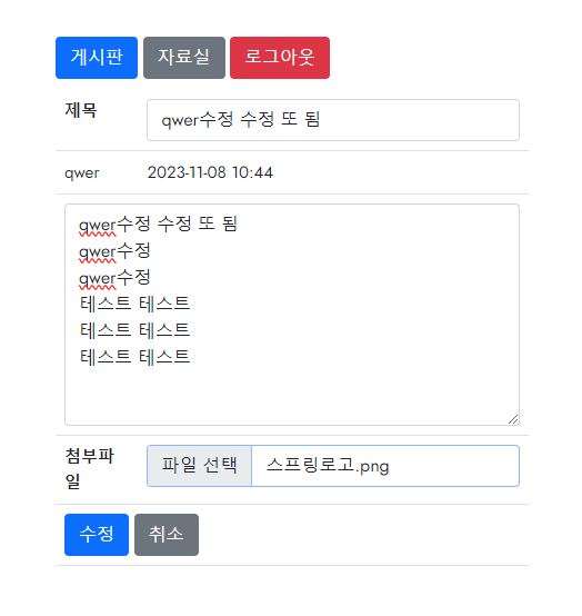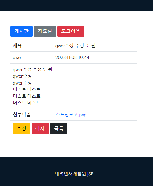 2. 수정 버튼 클릭 시, 수정 페이지(boardUpdateForm.jsp)로 이동합니다.