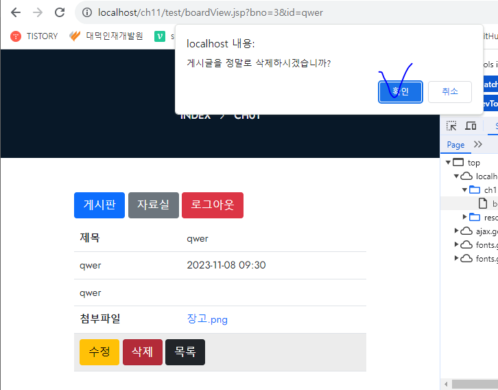 > "정말로 삭제하시겠습니까?" 알림창이 나타나고, [확인]버튼을 클릭 시 삭제가 처리(boardRemove.jsp) 될 수 있도록 해주세요.