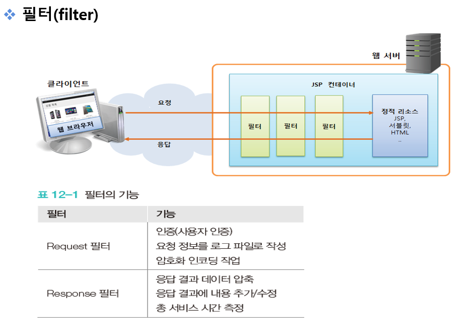 // 연속적으로 필터가 있으면 다음 필터로 제어를 넘기도록 FilterChain 객체 타입의 doFilter() 메소드를 작성