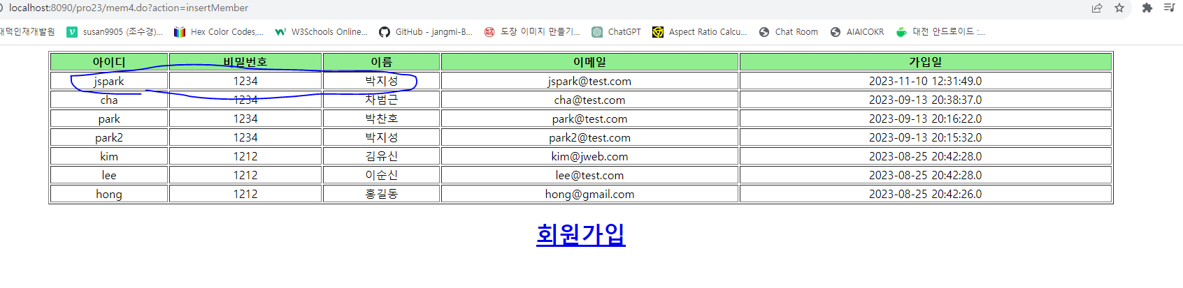 6. 다음의 주소로 요청하여 회원 정보를 입력하고 가입하기를 클릭하면 새 회원 정보가 추가되고 회원 목록이 표시된다.